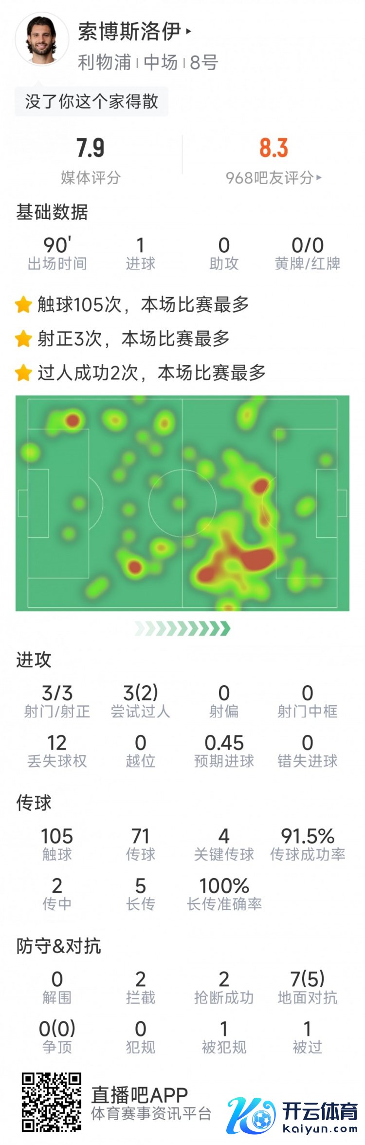 11月27日讯 在本轮欧冠,利物浦1-4不敌埃因霍温。以下为索博斯洛伊本场数据: