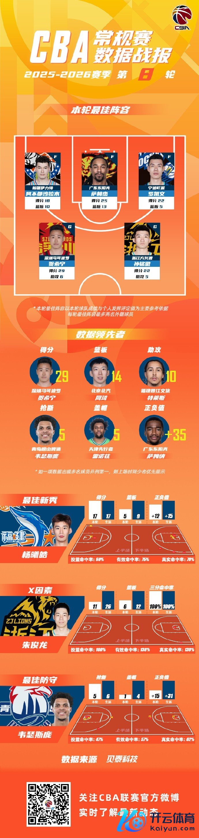 2025-2026赛季CBA联赛惯例赛第8轮限制较量,来悔改疆广汇篮球俱乐部的阿不齐沙拉木 ,广东宏远篮球俱乐部的萨林杰,宁波富邦町渥男篮的罗凯文,深圳新世纪烈豹篮球俱乐部的贺希宁和浙江广厦篮球俱乐部的孙铭徽入选CBA联赛惯例赛第8轮最好威望!