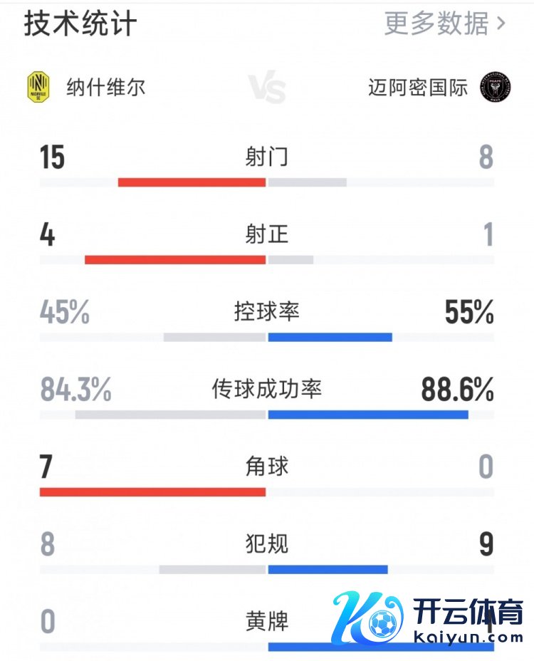3月12日讯 好意思冠杯1/8决赛首回合,迈阿密海外0-0战平纳什维尔,以下为两边全场数据对比: