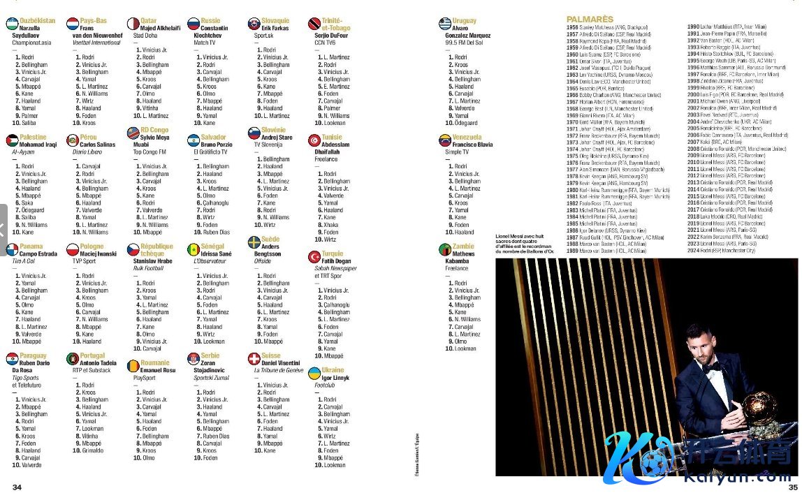 11月09日讯 《法国足球》本日将2024年金球奖前30名球员得分细则、99国记者的投票细则公布。
