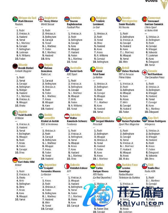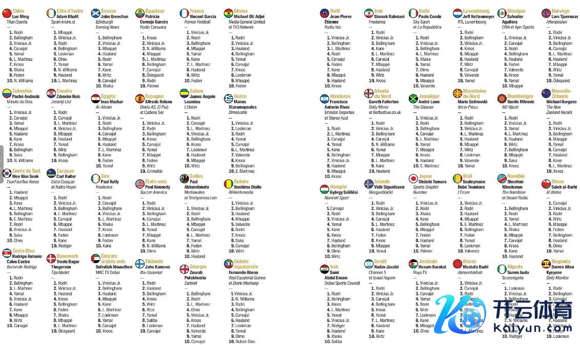 15个国度的记者首盘未遴荐维尼修斯大要罗德里,其中尼日利亚记者投卢克曼、韩国记者投哈兰德,阿根廷记者投克罗斯。