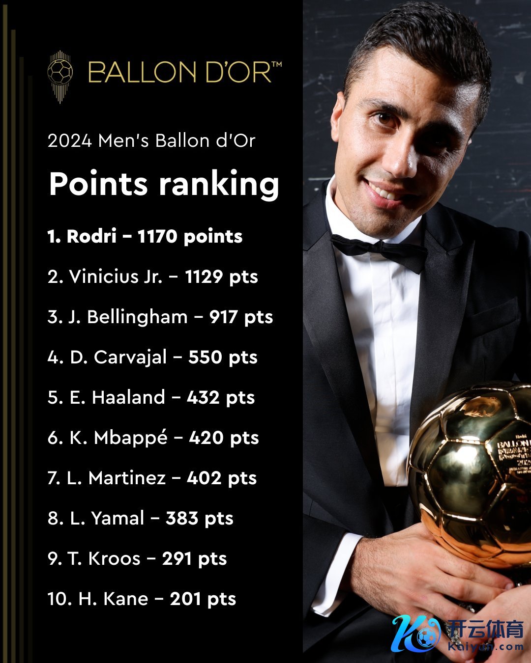 有49名记者将第一票投给了罗德里,有35名记者将第一票投给了维尼修斯。