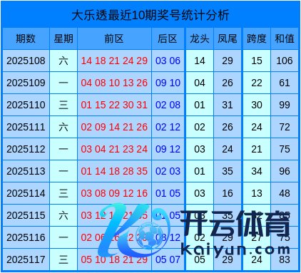 其中开出龙头号码为05,凤尾号码为29,跨度数据为24,和值数据为83;后区号码开出05、07,属于奇数+奇数、少许+大数组合号码。