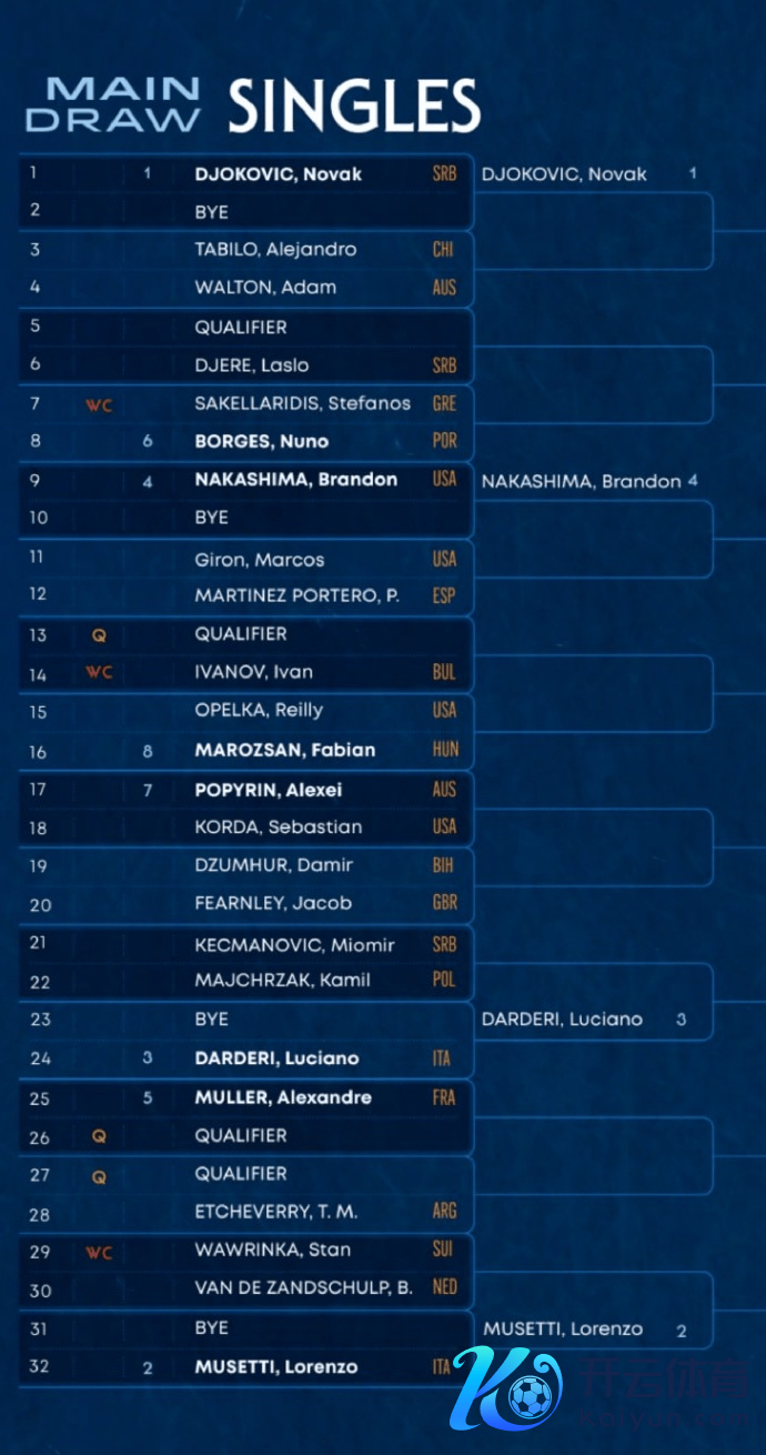 虎扑11月01日讯ATP250雅典站签表出炉。德约科维奇以头号种子身份出战,首轮比赛轮空,次轮将迎战塔比洛和沃尔顿之间的胜者。