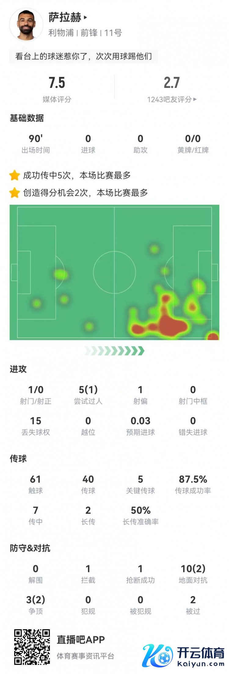 11月27日讯 利物浦在本轮欧冠1-4惨败埃因霍温,萨拉赫本场数据如下: