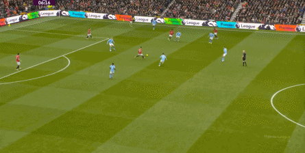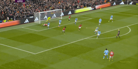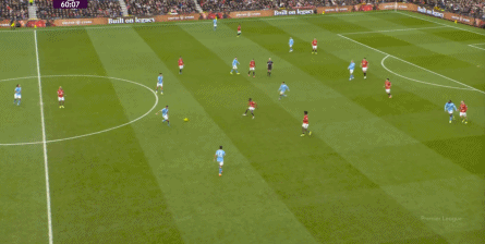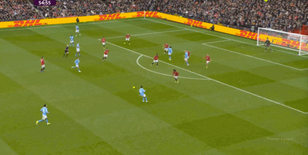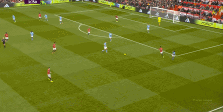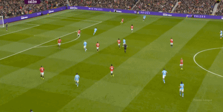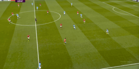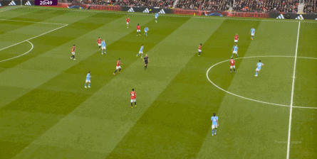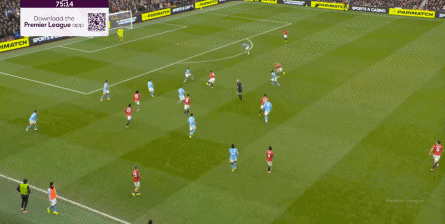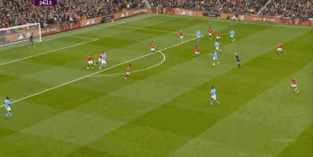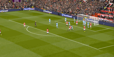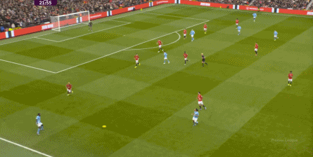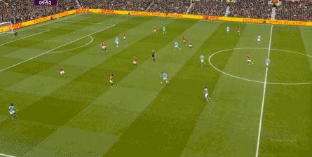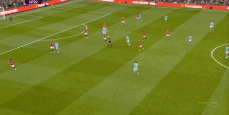 比如曼城曾在前场完成逼抢,让曼联需要在东谈主员不整的情况下垂危防护: