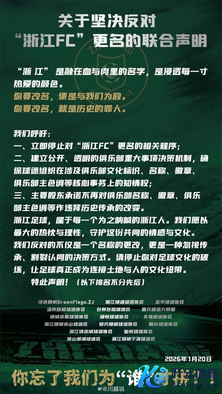 1月20日讯 针对浙江队将更名为浙江杭州队的据说,16家浙江球迷协会连合发表声昭示意反对。