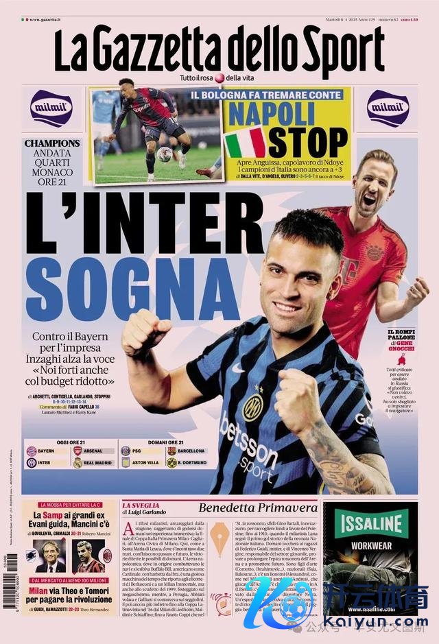 1、国米的梦思。欧冠:四分之一决赛,今晚作客慕尼黑。对阵拜仁,小因扎吉擢升了嗓门管待挑战:“预算减少的情况下,咱们很弘大。”