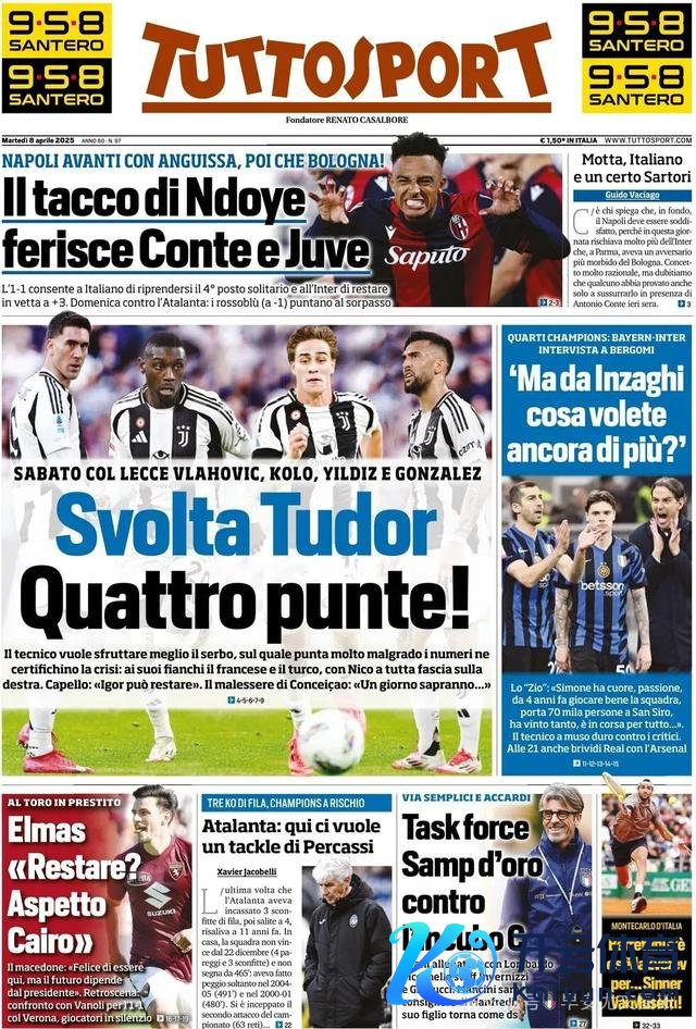 2、恩多耶的脚后跟伤到了孔蒂和尤文。那不勒斯先是依靠安圭萨取得逾越,然后是了不得的博洛尼亚!1比1让伊塔利亚诺重新回到了积分榜第四的位置,让海外米兰陆续逾越3分。周日对阵亚特兰大:红蓝军团(逾期1分)寻求超车。
