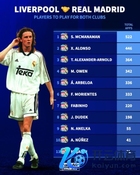 11月5日讯 手脚欧洲足坛两大朱门,利物浦和皇马曾招引诸多球星效能。德国转会市集清点了在两队均灵验力的球员总出场次数名次,麦克马纳曼为两队共出场522次居首,皇马主帅阿隆索则以446场位居次席。