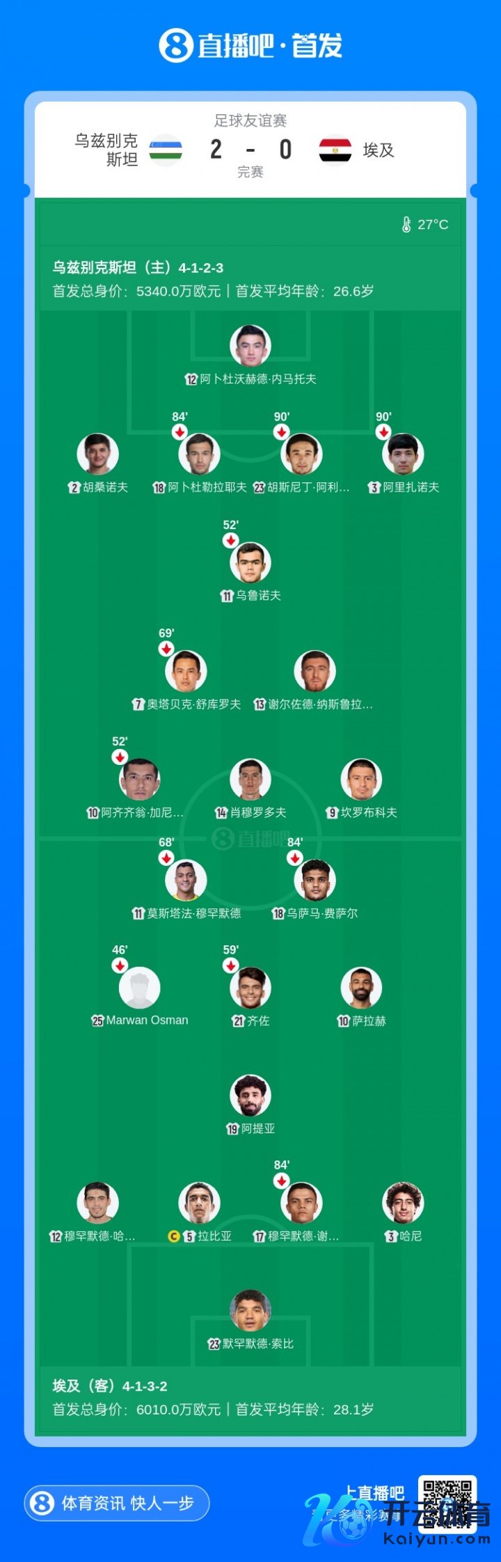 卡纳瓦罗上任后,乌兹别克斯坦3战赢得2胜1负,2-0校服科威特,1-2负于乌拉圭,2-0校服埃及。