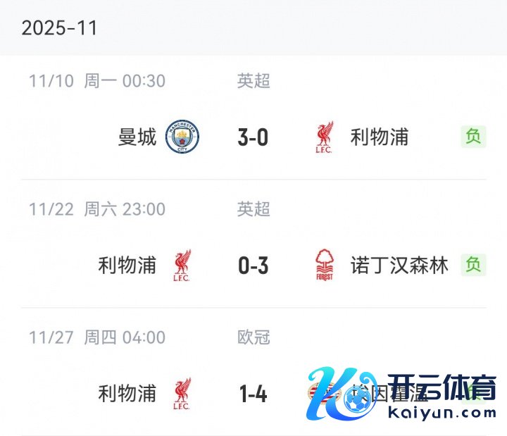 在这三场比赛中,利物浦均净丢3球(0-3曼城、0-3丛林、1-4埃因霍温),共丢10球。