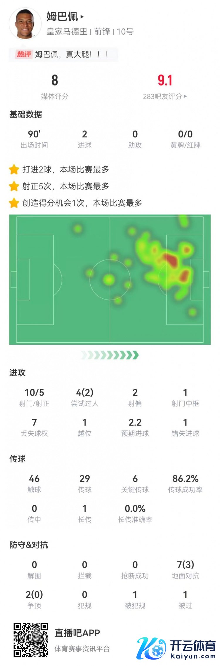 9月17日讯 皇马在本轮欧冠2-1打败马赛,姆巴佩本场数据如下: