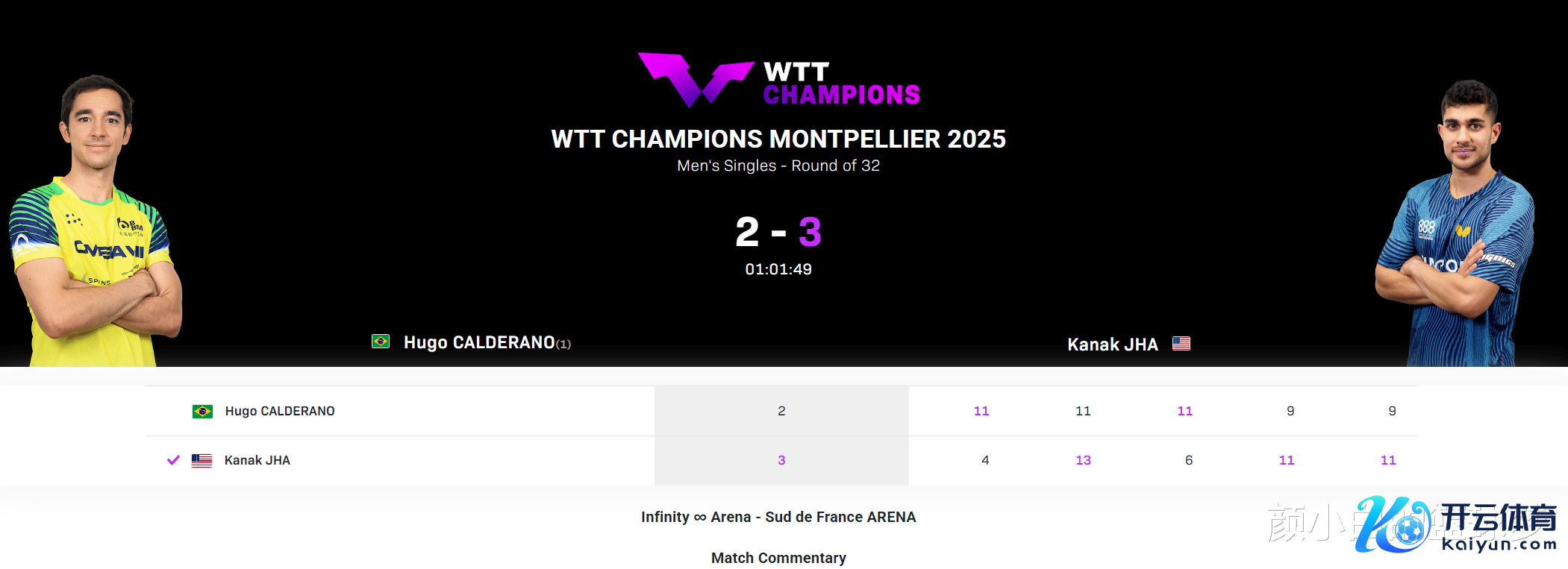 北京本领10月30日,WTT蒙彼利埃冠军赛男单1/16决赛,雨果(全国排行第三)2-3不敌贾哈(全国排行24)一轮游,五局比分:4-11,13-11,6-11,11-9,11-9。也即是说雨果在大比分2-1提升的情况下被贾哈大逆转了,要知说念雨果是本次法国站男单的头号种子,蒙彼利埃再度爆出高大冷门。