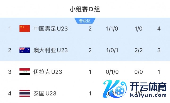 当今中国U23两轮4分,澳大利亚2轮3分,伊拉克1轮1分,泰国1轮0分。