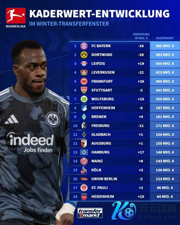 2月11日讯 德国转会市集列出了德甲球队冬窗之后的身价排行,拜仁9.65亿欧居首,多特4.83亿欧次席。