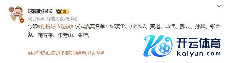 孙悦在2021年10月晓示了退役,随后在2022年12月6日举行了球衣退役庆典。庆典本日,繁密明星集聚一堂,体育圈中的杜锋、郭士强、朱芳雨等有名东谈主物,影视界的导演俞白眉、演员郑业成等,还有羽毛球走漏员鲍春来以及北京国安的球员们,约莫60东谈主到场复旧。这一幕充分展现了孙悦在东谈主际来往中的粗俗筹商和深切影响。