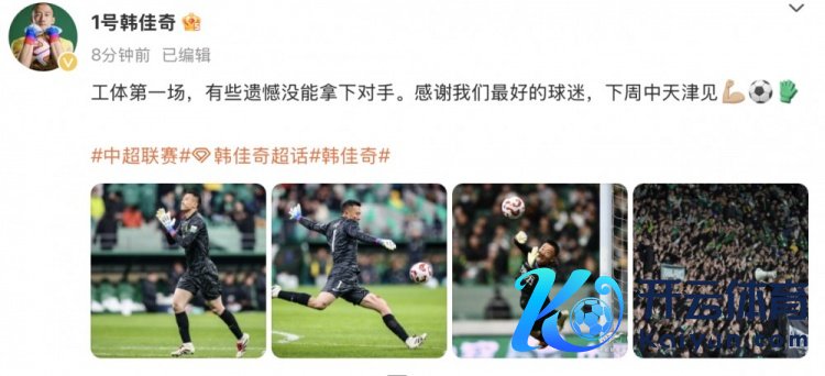 韩佳奇在社媒晒出比赛相片并配文写说念:“工体第一场,有些缺憾没能拿下敌手。感谢咱们最佳的球迷,下周中天津见💪🏼⚽️🧤”